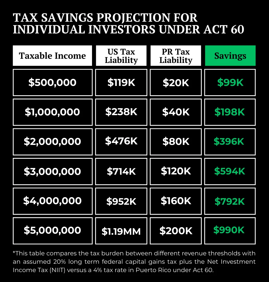 To truly appreciate how your life and business could change, identify your taxable income amount below to compare how much you could save using Puerto Rico's Act 60.